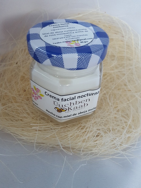 Crema facial nocturna ingredientes activos, miel de abeja Melipona, aceite de rosa mosqueta, aceite de coco, vitamina E.